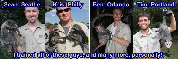 This website provides plenty of how-to tips for decreasing or eliminating conflicts with many types of wild animals. However, if you have an advanced wildlife problem, in particular an animal living in your attic, or if you need hands-on handling of wildlife, I definitely recommend hiring a professional licensed wildlife removal expert. I have spent the last eleven years talking to and meeting hundreds of wildlife pros in every corner of the United States, and I have also personally trained many of them. If you need a critter removal specialist in your town, click on the below link to my professionals directory, and you will find someone near you to come to your property and solve your animal issue.